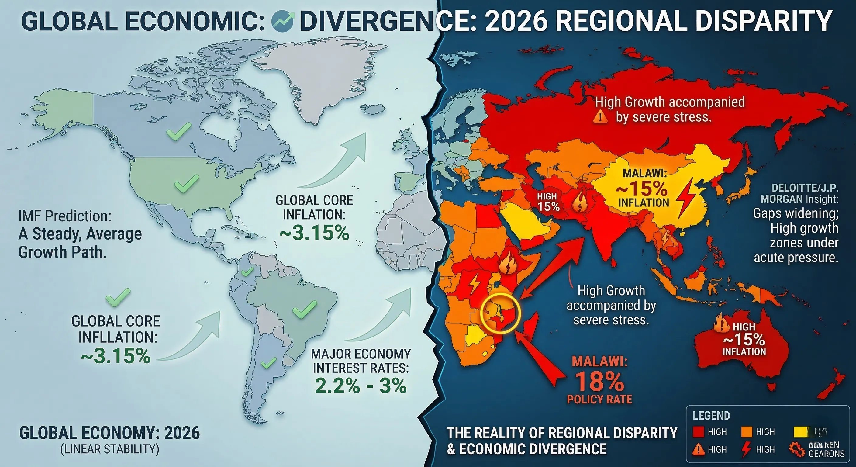 - 지역별 경제 격차 심화: IMF의 3.15% 안정적 성장 전망에도 불구하고, J.P. Morgan은 지역별 상이한 결과를 예상하며, 말라위 사례처럼 높은 성장률과 함께 심각한 인플레이션 및 고금리가 동반될 수 있음을 보여줍니다.