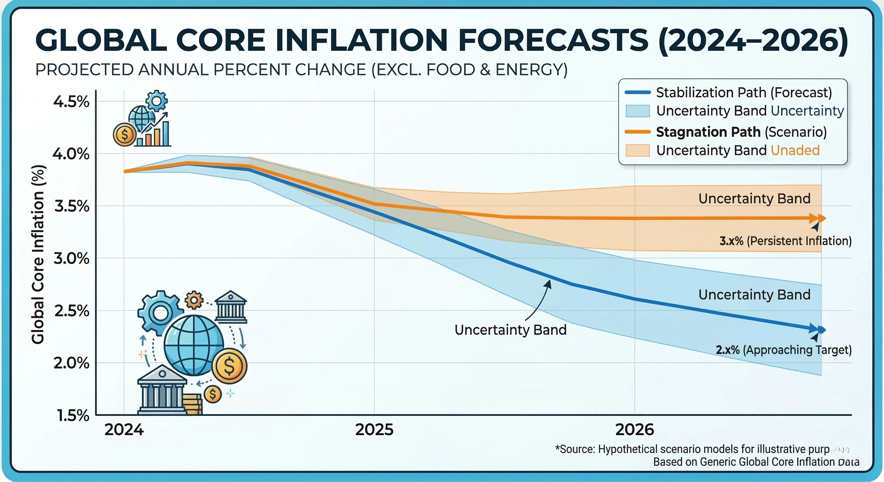 J.P. Morgan Global Research에 따르면, 2026년 글로벌 핵심 인플레이션은 2.8%로 안정적일 것으로 전망되며, 유럽중앙은행은 비에너지 인플레이션이 2.2%로 둔화될 것으로 예상합니다.