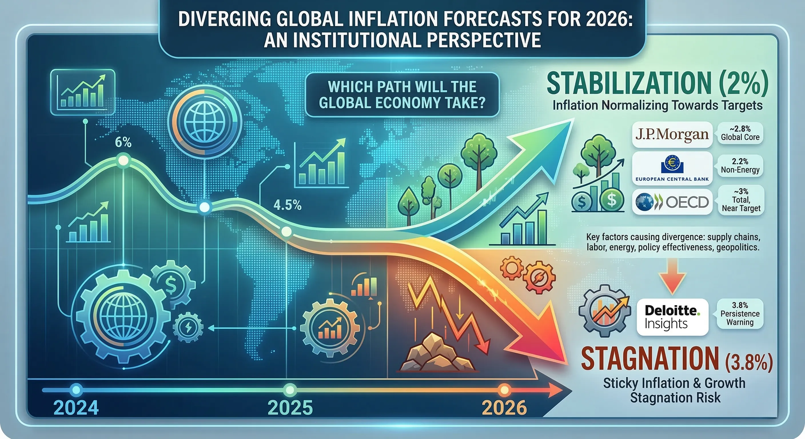 - 엇갈린 인플레이션 전망: J.P. Morgan, ECB, OECD는 2%대 안정화/둔화를 예상(2.2~3%)하는 반면, Deloitte는 3.8% 수준의 고착화를 경고합니다. 이는 인플레이션 구성 요소와 통화 정책 효과에 대한 해석 차이에서 비롯됩니다.