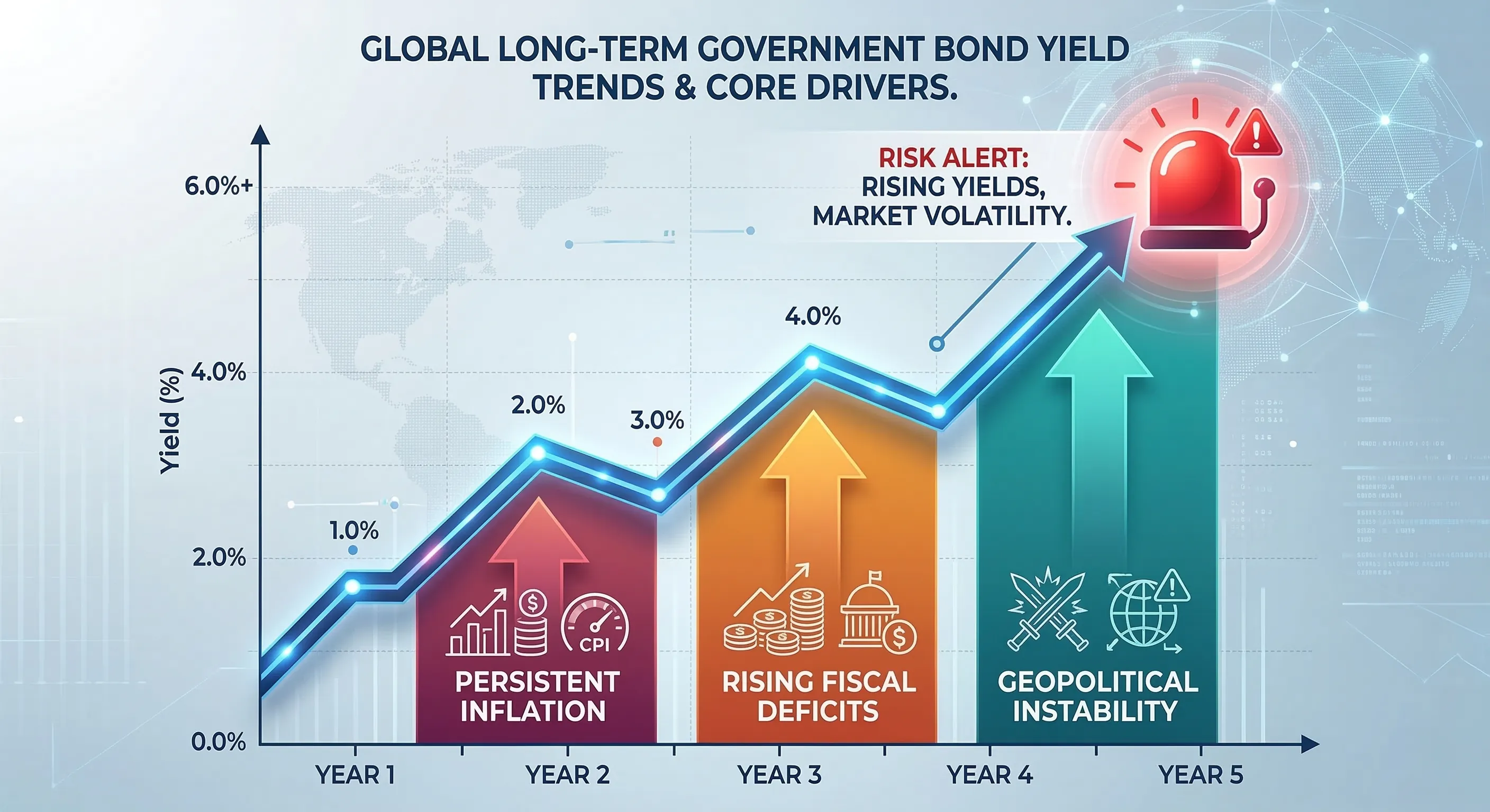 BCA 글로벌 경제 전망은 지속적인 인플레이션, 증가하는 재정 적자, 지정학적 불안정이 전 세계 장기 국채 수익률을 높이는 핵심 동인이라고 명시하고 있습니다.